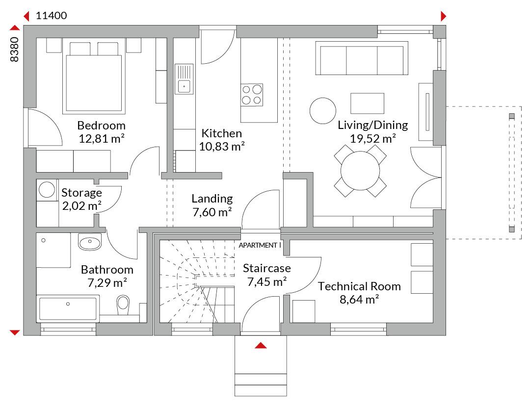 • Apartment 1 (ground floor): open-plan kitchen, spacious living/dining area, hallway, bathroom with bathtub, bedroom.