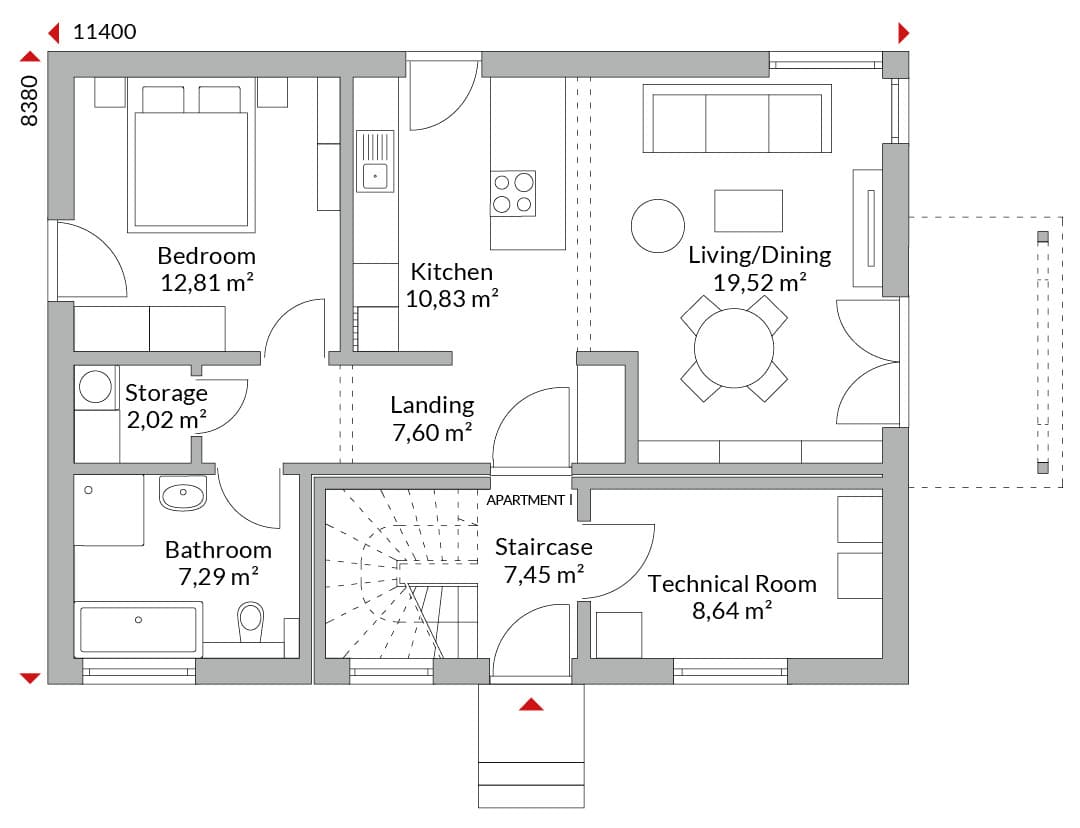 One-and-a-half-storey house with two apartments. Gable roof with 30° pitch. Knee wall height: 1.75 m.