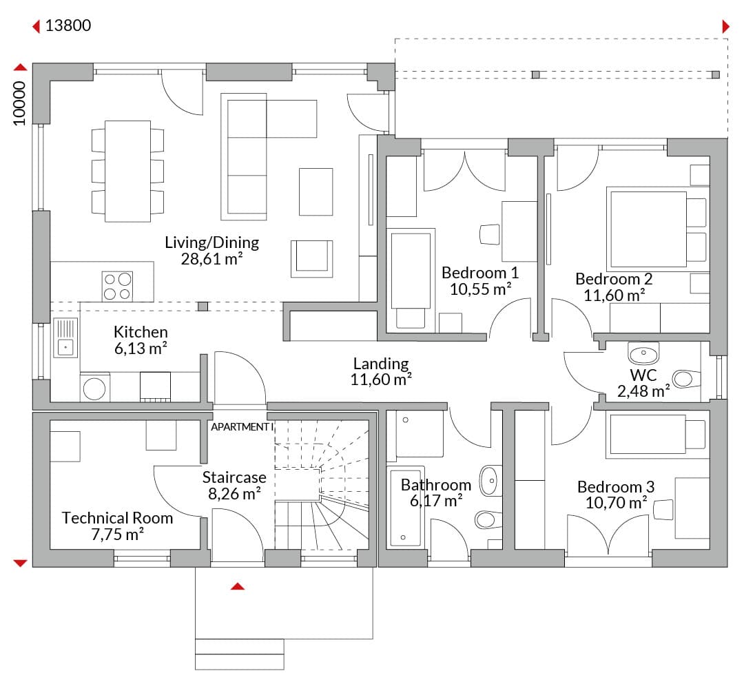 Two-storey house with two apartments. Hipped roof with 22° pitch.