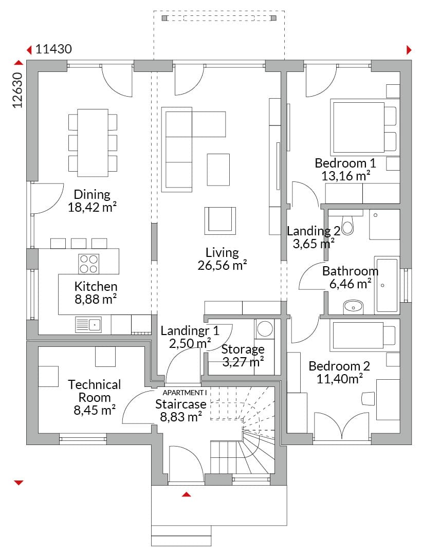 • Ground floor apartment: open-plan kitchen, spacious living/dining area, entrance hall, bathroom with bathtub, walk-in wardrobe area, hallway, two bedrooms.