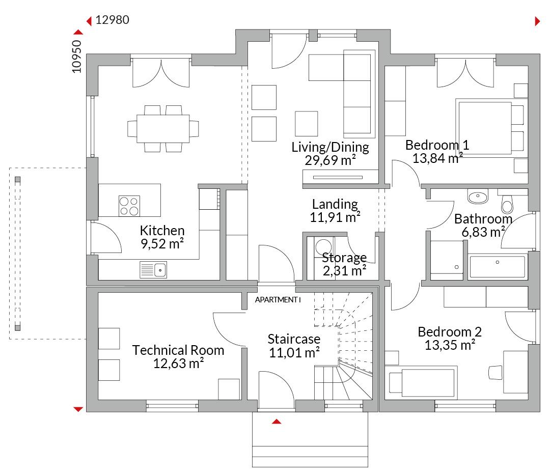 One-and-a-half-storey house with two apartments. Gable roof with 30° pitch. Knee wall height: 1.75 m.