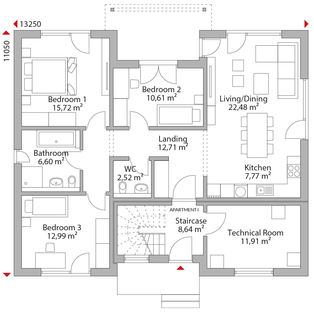 • Apartment 1 (ground floor): open-plan kitchen, spacious living/dining area, hallway, bathroom with bathtub, guest WC, three bedrooms, covered terrace with recessed exterior wall.