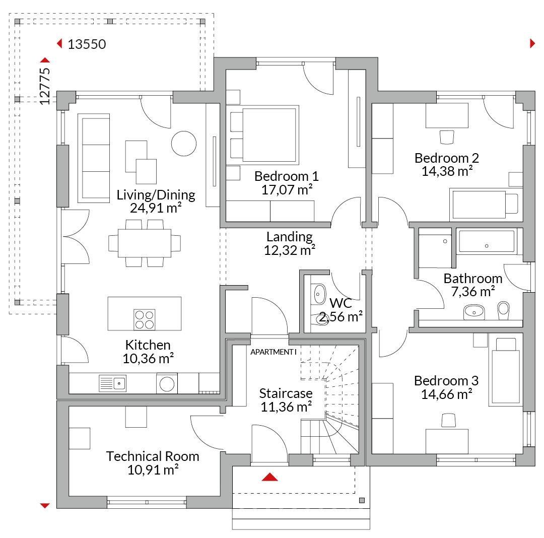 Two-storey house with two apartments. Hipped roof with 22° pitch.