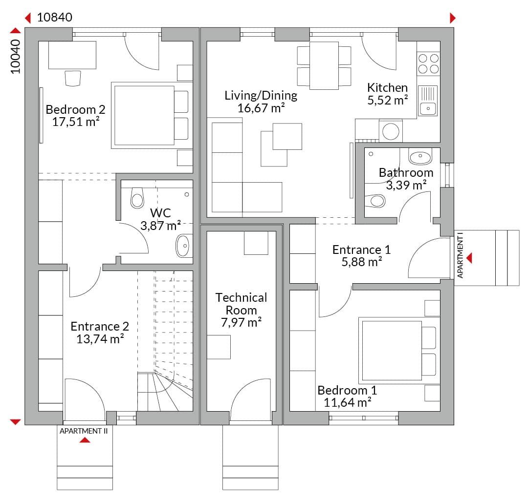 One-and-a-half-storey house with two apartments and separate entrances. Shared technical room with separate external access for both apartments. Gable roof with 25° pitch. Knee wall height: 1.75 m.