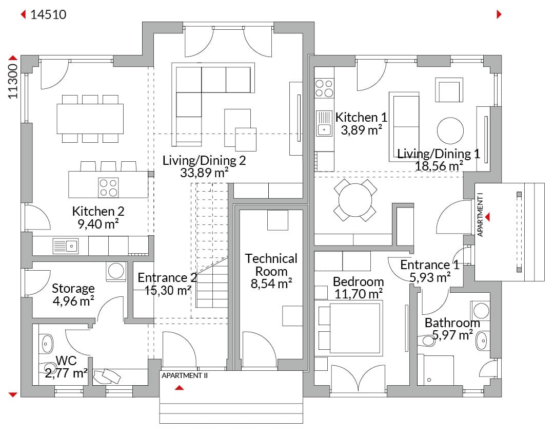 Two-storey townhouse with two apartments and separate entrances. Shared technical room with separate external access for both apartments. Hipped roof with 20° pitch.